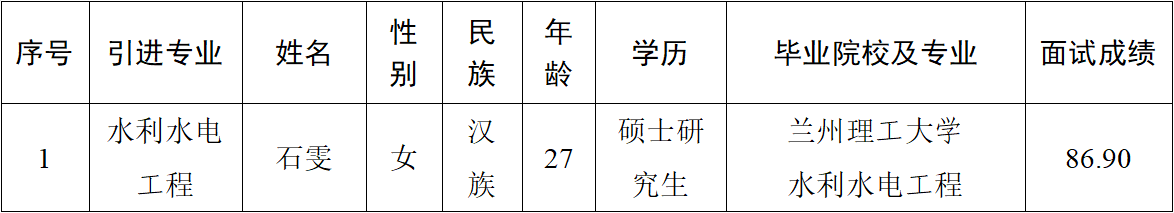2024-02-29根据《平凉市2024年引进急需紧缺人才公告》,市产投集团对2024年拟引进的5名急需紧缺人才完成了资格审查、面试等工作程序,已完成2名拟引进人才的考察、体检工作,其余3名拟引进人才为应届生,待取得毕业证后另行考察公示。现对2名已完成考察的人员进行公示